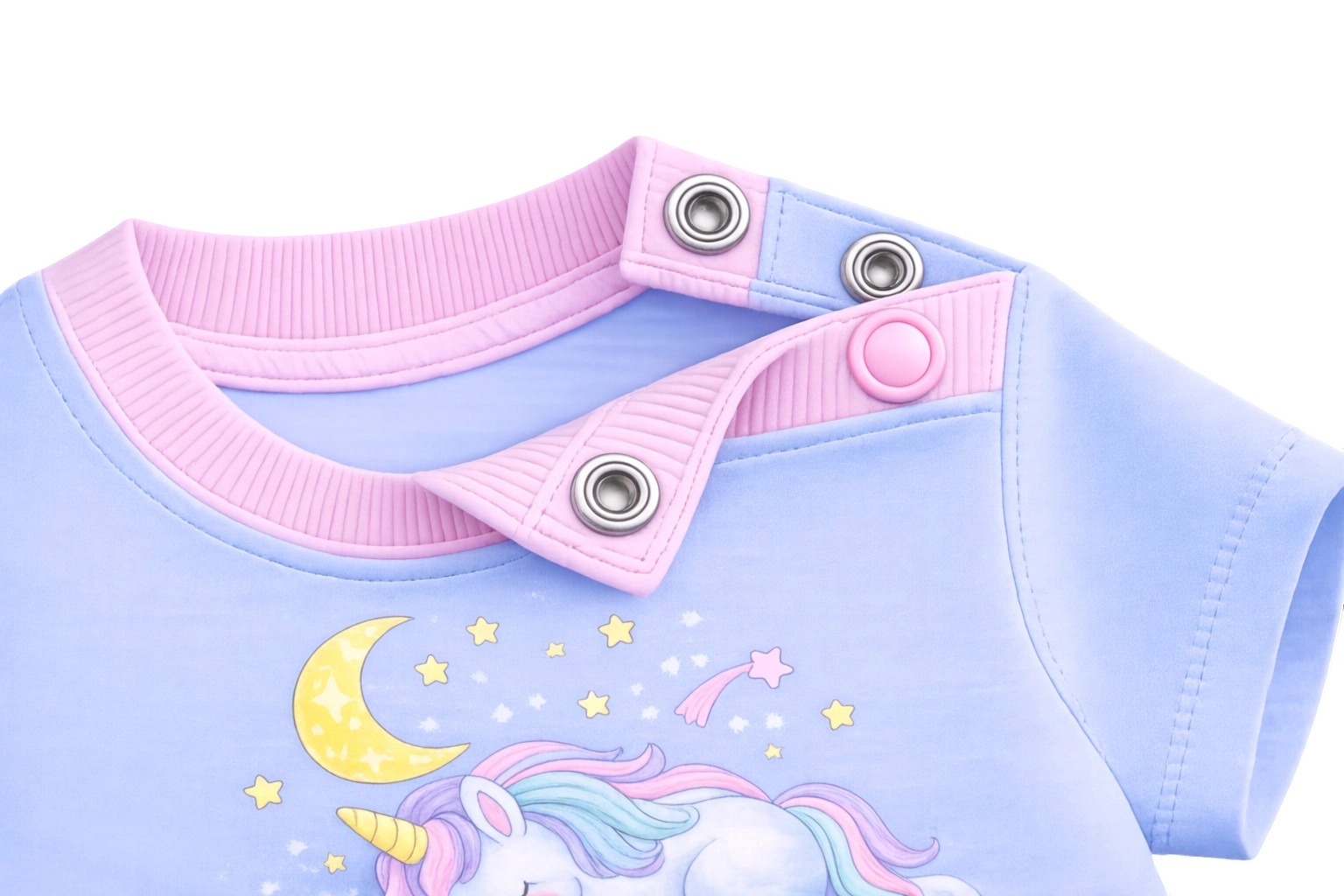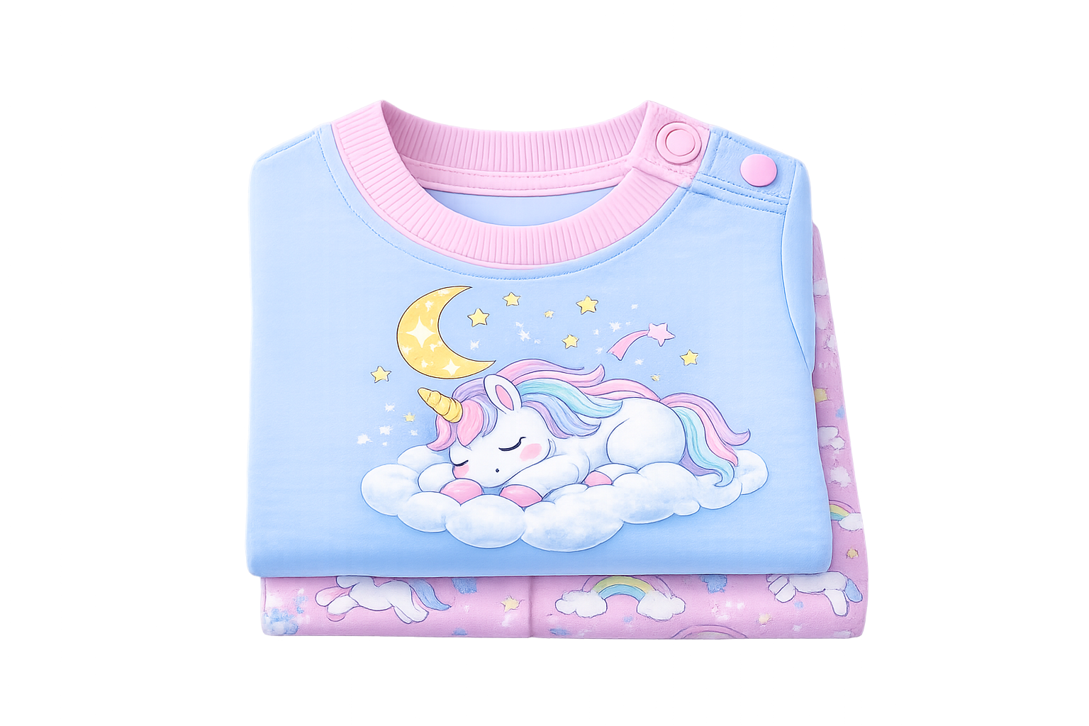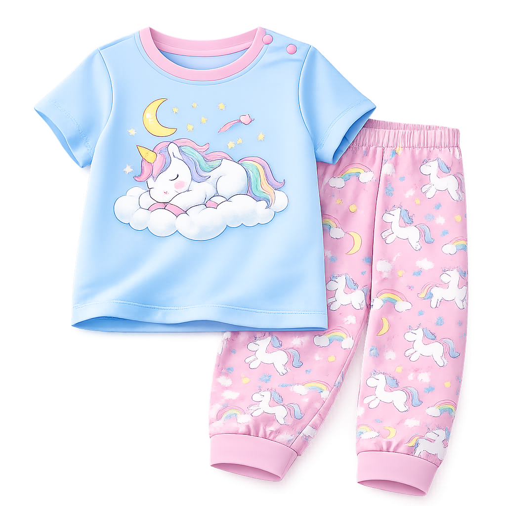 Pohodlné dvoudílné pyžamo pro klidný spánek i domácí pohodu. Horní díl zdobí roztomilý motiv jednorožce, kalhoty doplňuje hravý celopotisk. Pyžamo spojuje pohodlí, příjemný vzhled a střih vhodný pro každodenní nošení.